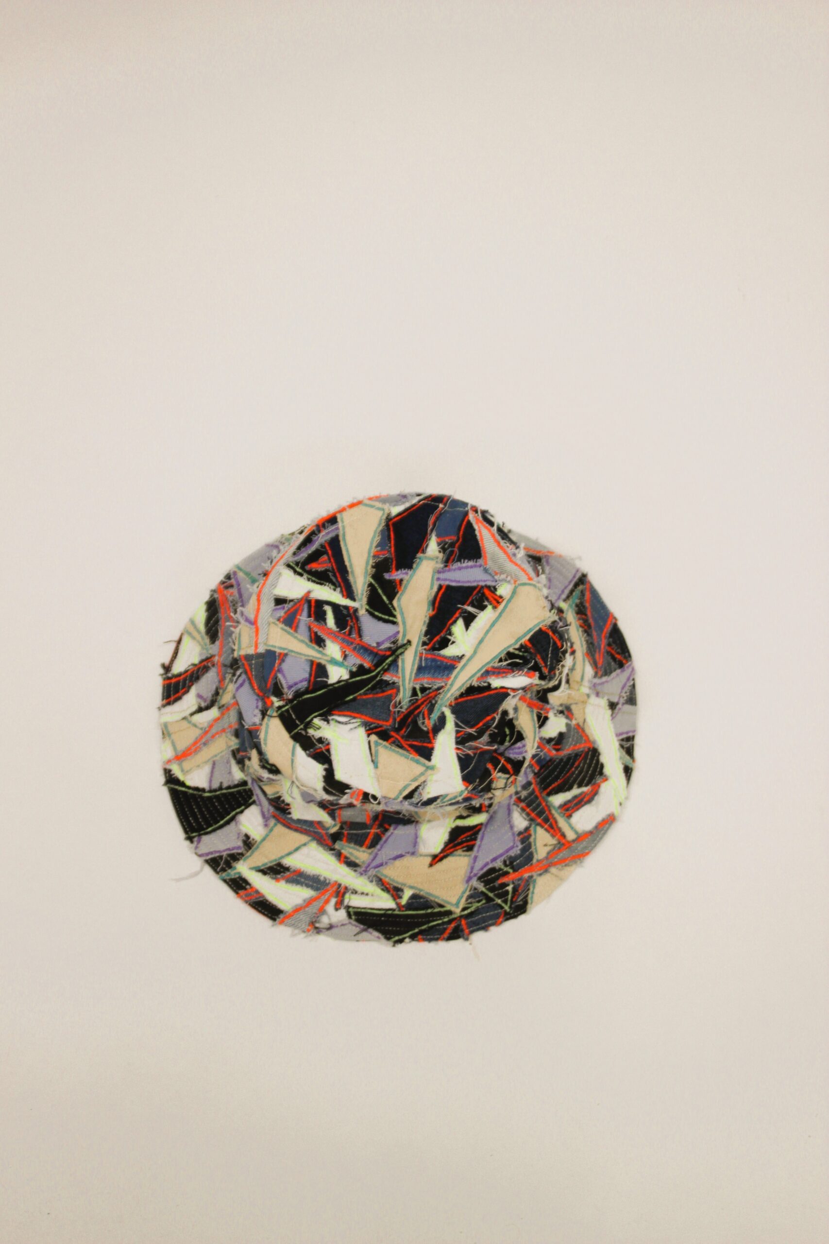 This product is made from 100% re-used denim. The inside is black stretch denim finished with colored denim scraps. And neon stitching on both the outside and the scraps. For the quilted edge we used thick white thread.