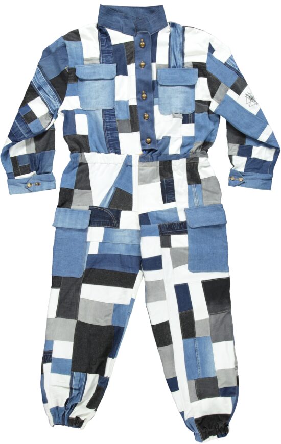 The suits from the Denim 2.0 collection are all non-labeled, which means the suit is for everyone to wear. The elastic that is incorporated in the suit makes it possible for several people to wear the suit. The suit is made by hand from old denim jeans. The Multi Denim suit is made from leftover pieces of denim in almost all colors of blue denim in combination with white and black denim. This suit is fully sustainable due to the use of only old and second-handed jeans and leftover buttons. The suit is suitable for size L/XL.