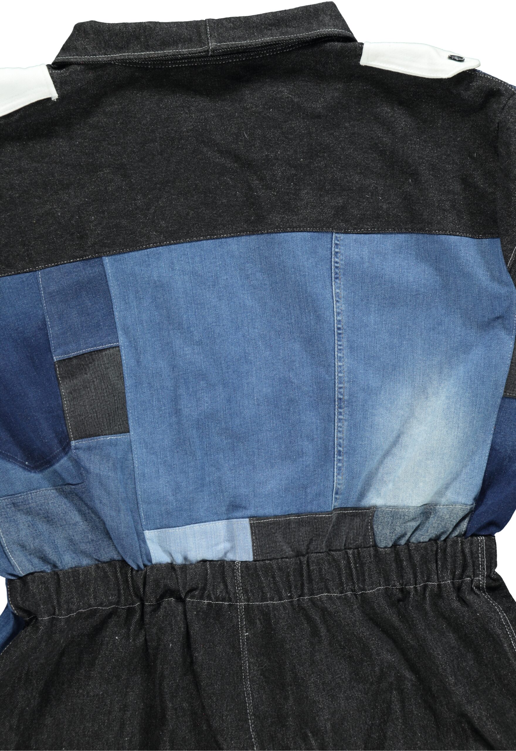 This suit is made from 50% black denim and 50% mixed denim parts from old jeans.